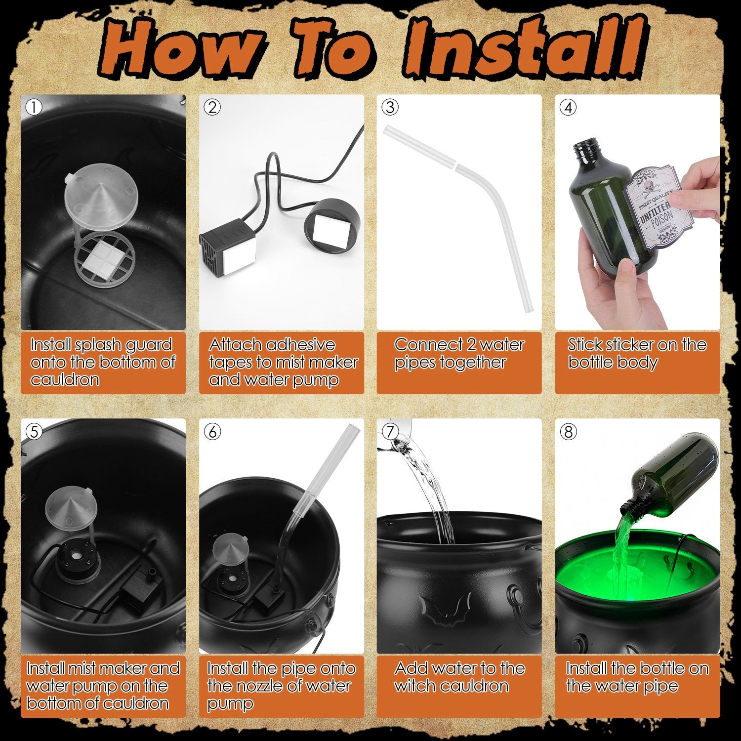 - Power On: Plug into outlet and press button. The pump creates the pouring illusion while the mister adds thick green fog and a soft glow through the skeleton décor.